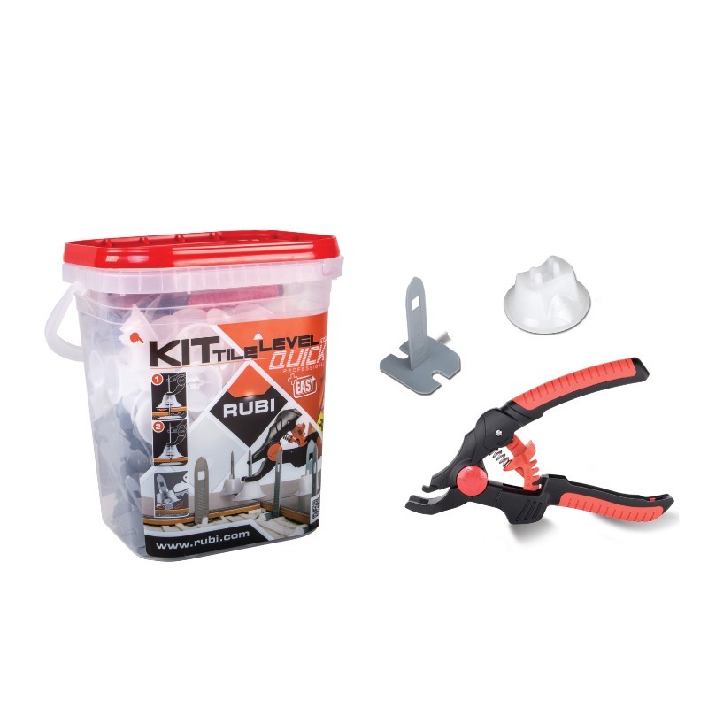 Vyrovnávací systém Rubi pre rýchlu pokládku obkladov a dlažby v novej sade pre rok 2016. Moderné pevné kliešte, pritláčacie adaptéry a podstavce v plastovom vedre.