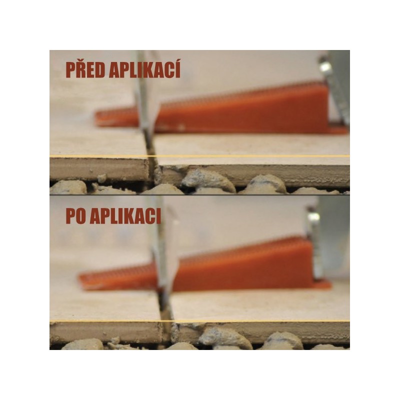 Sponu jednoducho vložíte pod dlaždicu a pomocou klieští zasuniete klin, čím sa vyrovná povrch susedných dlaždíc. Po stuhnutí lepidla spony odstránite jednoduchým kopnutím. Kliny sú opakovane použiteľné.